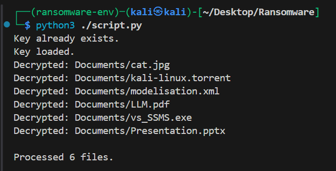 - Recursively walks through a specified folder (e.g., “Documents”) and encrypts/decrypts each file using Fernet.