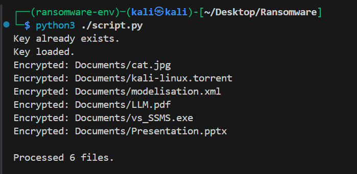 - Run the script in encrypt mode to observe file encryption.